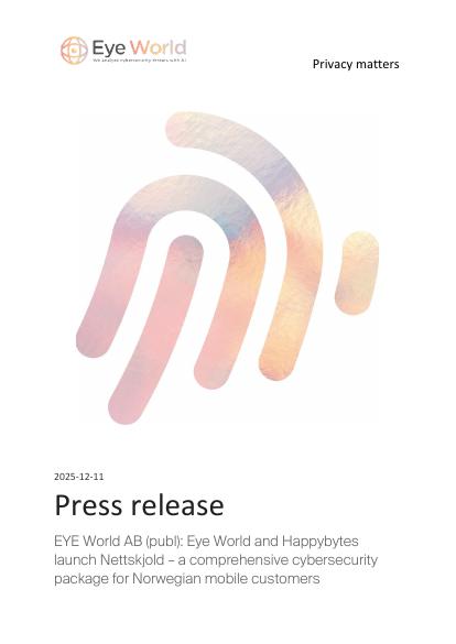 Eye World AB (publ) ("Eye World" or the "Company") announces today that the Company, together with the Norwegian mobile operator Happybytes, is launching Nettskjold, a new premium offering that provides Norwegian mobile customers with comprehensive digital protection. The launch follows the agreement communicated by Eye World on 29 August 2025 and marks an important step in the continued rollout of the Company's cybersecurity portfolio across the Nordic telecom market.