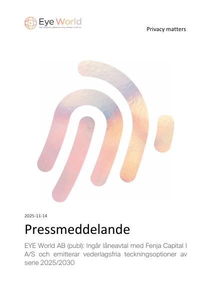 Som kommunicerades genom pressmeddelande den 17 oktober 2025 har Eye World AB (publ) ("Bolaget") ingått ett aktieöverlåtelseavtal avseende förvärv av samtliga aktier i ett brittiskt SaaS-bolag inom cybersäkerhet ("Målbolaget"). Tillträdesdagen är planerad till måndag 17 november. Köpeskillingen för samtliga aktier i Målbolaget uppgår till cirka 230 MSEK och ska vid tillträdet erläggas enligt följande: (i) 50 procent genom nyemitterade aktier i Bolaget som emitteras och kvittas mot betalning genom utfärdade skuldebrev, (ii) 25 procent genom en räntefri säljarrevers med tolv månaders löptid, och (iii) 25 procent kontant. I syfte att finansiera den kontanta delen har Bolaget idag ingått ett låneavtal med Fenja Capital I A/S ("Långivaren") uppgående till 70 MSEK. Som en del av lånevillkoren har styrelsen, med stöd av bemyndigande från extra bolagsstämma den 23 september 2025, beslutat att genomföra en riktad emission av 1 030 852 teckningsoptioner av serie 2025/2030 till Långivaren. Detta låneavtal avser endast en kortsiktig bryggfinansiering. Eye World är tillsammans med Bolagets finansiella rådgivare Houlihan Lokey i pågående process att hitta en långsiktig finansieringspartner som ska säkerställa en långsiktig kreditlina att nyttja för denna och kommande förvärvstransaktioner. Ambitionen är att ha en långsiktig finansieringspartner på plats inom tre till fyra månader.