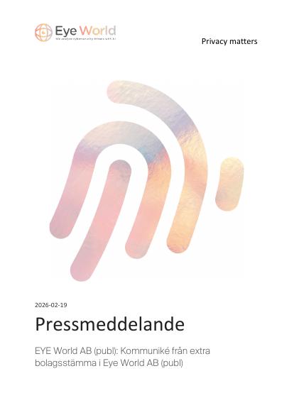 Extra bolagsstämma i Eye World AB (publ), org.nr 559005-9415 ("Bolaget"), ägde rum idag den 19 februari 2026 kl. 10.00 i Eversheds Sutherland Advokatbyrås lokaler på Sveavägen 20 i Stockholm. Samtliga beslut fattades i enlighet med tidigare offentliggjorda förslag och med erforderlig majoritet. De huvudsakliga besluten fattade av stämman framgår nedan.