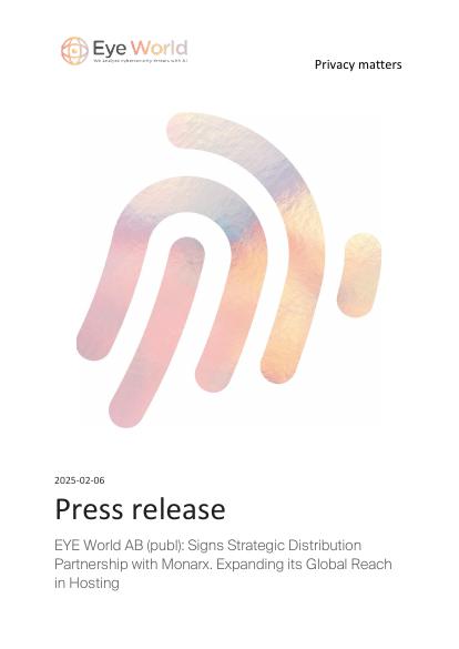 EYE World AB (publ) announces a strategic distribution partnership with Monarx. Under this agreement, Monarx will distribute EYE World's cybersecurity solutions to its extensive global network of hosting resellers and partners.