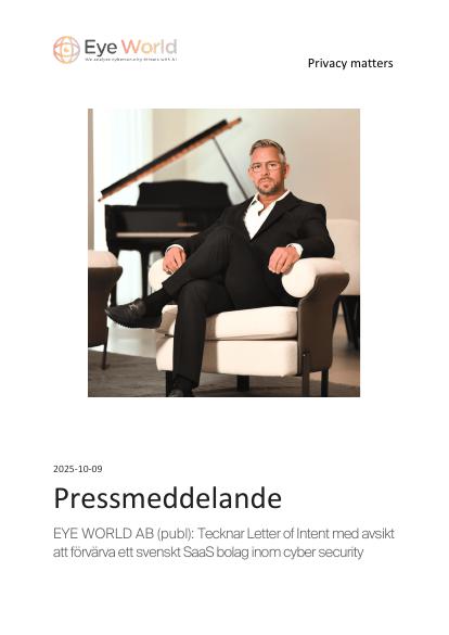 Eye World AB ("EYE" eller "Bolaget") meddelar idag att bolaget har signerat ett nytt Letter of Intent (LOI) för att förvärva ett cybersäkerhetsbolag med stark tillväxt och stabil återkommande intäktsbas. Transaktionens villkor initialt avser en inkråmsaffär och köpeskillingen är satt till 2,7 MEUR.