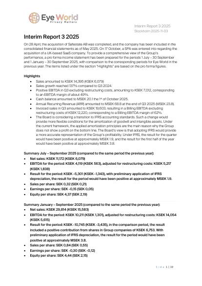On 28 April, the acquisition of Safestate AB was completed, and the company has been included in the consolidated financial statements as of May 2025. On 17 October, a SPA was entered into regarding the acquisition of a UK-based SaaS company. To provide a comprehensive view of the Group's performance, a pro forma income statement has been prepared for the periods 1 July - 30 September and 1 January - 30 September 2025, with comparison to the corresponding periods for Eye World in the previous year. The items listed under the section "Highlights" are based on the pro forma figures.