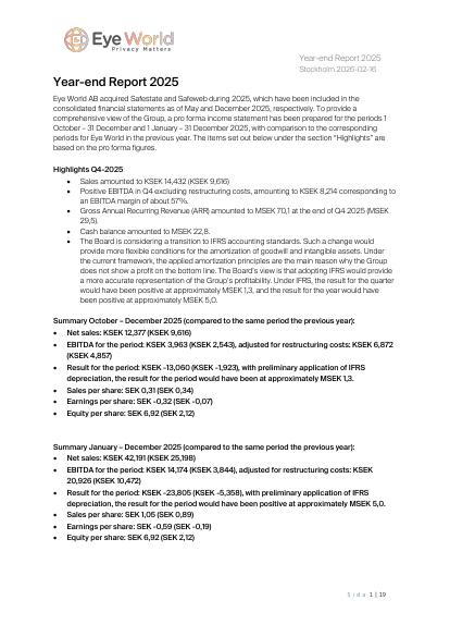 Eye World AB acquired Safestate and Safeweb during 2025, which have been included in the consolidated financial statements as of May and December 2025, respectively. To provide a comprehensive view of the Group, a pro forma income statement has been prepared for the periods 1 October - 31 December and 1 January - 31 December 2025, with comparison to the corresponding periods for Eye World in the previous year. The items set out below under the section "Highlights" are based on the pro forma figures.