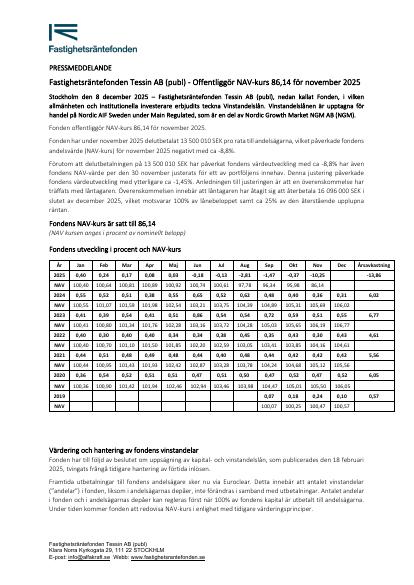 Fastighetsräntefonden Tessin AB (publ) - Offentliggör NAV-kurs 86,14 för november 2025