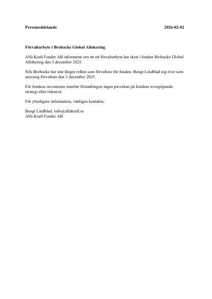 Alfa Kraft Fonder AB informerar om att ett förvaltarbyte har skett i fonden Brobacke Global Allokering den 3 december 2025.