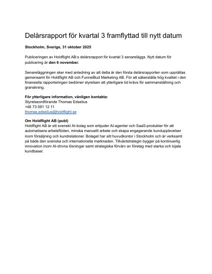 Publiceringen av Holdflight AB:s delårsrapport för kvartal 3 senareläggs. Nytt datum för publicering är den 6 november.