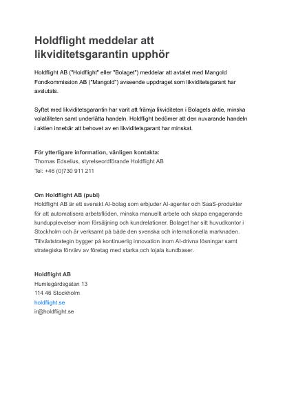 Holdflight AB ("Holdflight" eller "Bolaget") meddelar att avtalet med Mangold Fondkommission AB ("Mangold") avseende uppdraget som likviditetsgarant har avslutats.