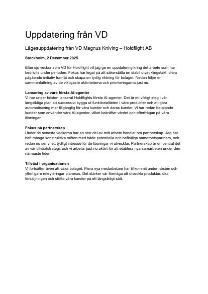 Lägesuppdatering från VD Magnus Kniving - Holdflight AB