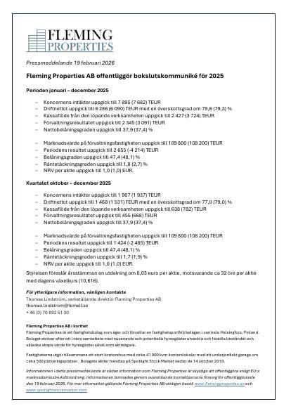 Informationen i detta pressmeddelande är sådan information som Fleming Properties är skyldiga att offentliggöra enligt EU:s marknadsmissbruksförordning. Informationen lämnades genom ovanstående kontaktpersons försorg för offentliggörande den 19 februari 2026. För mer information gällande Fleming Properties AB vänligen besök www.flemingproperties.se och www.spotlightstockmarket.com