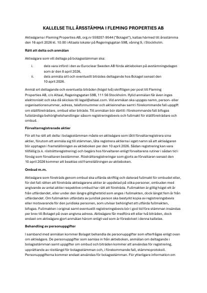 Aktieägarna i Fleming Properties AB, org.nr 559207-9544 ("Bolaget"), kallas härmed till årsstämma den 16 april 2026 kl. 10.00 i Altaals lokaler på Regeringsgatan 59B, våning 9, i Stockholm.