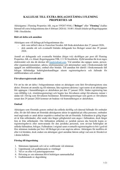 Aktieägarna i Fleming Properties AB, org.nr 559207-9544, ("Bolaget" eller "Fleming") kallas härmed till extra bolagsstämma den 4 februari 2026 kl. 10.00 i Altaals lokaler på Regeringsgatan 59B i Stockholm.