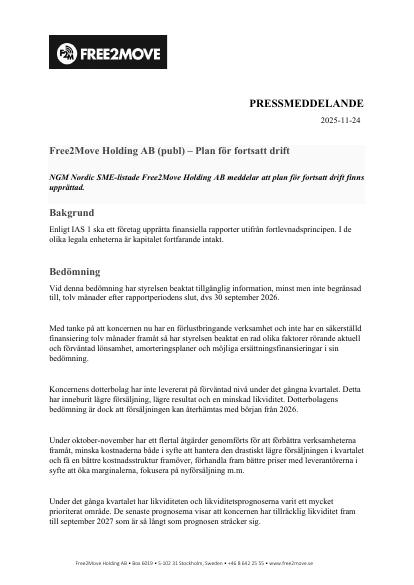Denna information är sådan information som Free2Move Holding AB är skyldig att offentliggöra enligt EU:s marknadsmissbruksförordning. Informationen lämnades, genom nämnd kontaktpersons försorg, för offentliggörande den 24 november 2025, klockan 18.00