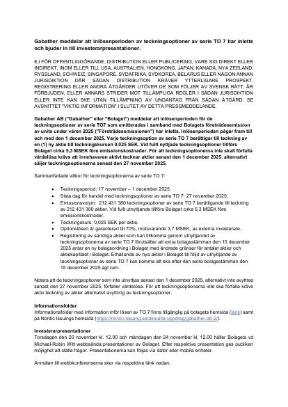 Gabather meddelar att inlösenperioden av teckningsoptioner av serie TO 7 har inletts och bjuder in till investerarpresentationer.