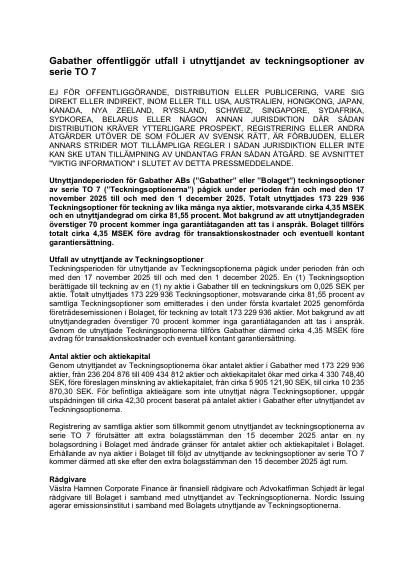Utnyttjandeperioden för Gabather ABs ("Gabather" eller "Bolaget") teckningsoptioner av serie TO 7 ("Teckningsoptionerna") pågick under perioden från och med den 17 november 2025 till och med den 1 december 2025. Totalt utnyttjades 173 229 936 Teckningsoptioner för teckning av lika många nya aktier, motsvarande cirka 4,35 MSEK och en utnyttjandegrad om cirka 81,55 procent. Mot bakgrund av att utnyttjandegraden överstiger 70 procent kommer inga garantiåtaganden att tas i anspråk. Bolaget tillförs totalt cirka 4,35 MSEK före avdrag för transaktionskostnader och eventuell kontant garantiersättning.