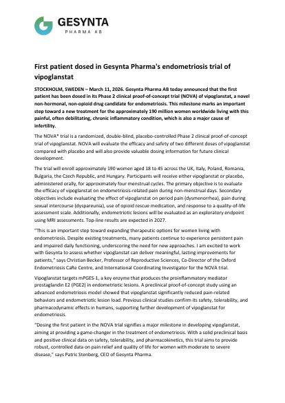 STOCKHOLM, SWEDEN - March 11, 2026. Gesynta Pharma AB today announced that the first patient has been dosed in its Phase 2 clinical proof-of-concept trial (NOVA) of vipoglanstat, a novel non-hormonal, non-opioid drug candidate for endometriosis. This milestone marks an important step toward a new treatment for the approximately 190 million women worldwide living with this painful, often debilitating, chronic inflammatory condition, which is also a major cause of infertility.