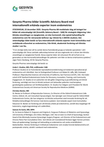 STOCKHOLM, 22 december 2025. Gesynta Pharma AB meddelade idag att bolaget har bildat ett vetenskapligt råd (Scientific Advisory Board - SAB) för strategisk rådgivning i den kliniska utvecklingen av vipoglanstat, en icke-hormonell, icke-opioid behandling för endometrios som för närvarande befinner sig i klinisk fas 2 (NOVA-studien). Det vetenskapliga rådet består av fyra internationellt erkända experter inom kvinnohälsa med omfattande erfarenhet av endometrios, från klinik, akademisk forskning och kliniska studier i sen fas.