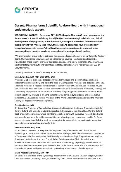 STOCKHOLM, SWEDEN - December 22nd, 2025. Gesynta Pharma AB today announced the formation of a Scientific Advisory Board (SAB) to provide strategic advice in the clinical development of vipoglanstat, a non-hormonal, non-opioid treatment for endometriosis that is currently in Phase 2 (the NOVA trial). The SAB comprises four internationally recognized experts in women's health with extensive experience in endometriosis, spanning clinical practice, academic research and late-stage clinical studies.