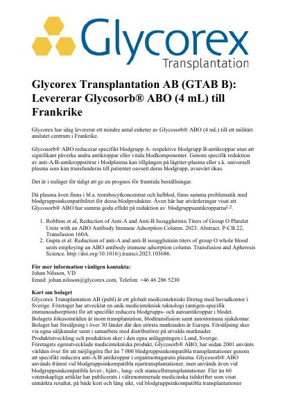 Glycorex har idag levererat ett mindre antal enheter av Glycosorb® ABO (4 mL) till ett militärt anslutet centrum i Frankrike.