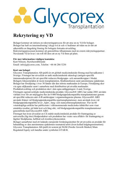 Glycorex Transplantation AB (publ) är ett globalt medicintekniskt företag med huvudkontor i Sverige. Företaget har utvecklat en unik medicinteknisk teknologi (antigen-specifik immunoadsorption) för att specifikt reducera blodgrupps- och autoantikroppar i blodet.