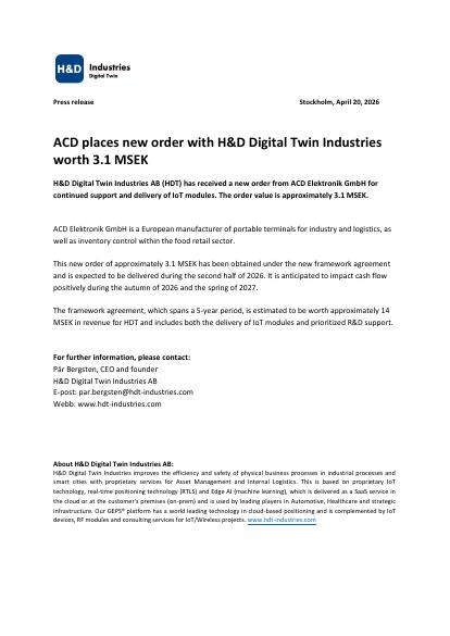 H&D Digital Twin Industries AB (HDT) has received a new order from ACD Elektronik GmbH for continued support and delivery of IoT modules. The order value is approximately 3.1 MSEK.