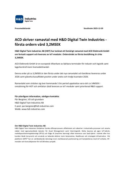 H&D Digital Twin Industries AB (HDT) har tecknat ett femårigt ramavtal med ACD Elektronik GmbH om fortsatt support och leverans av IoT-moduler. Ordervärdet av första beställning är cirka 3,2MSEK.