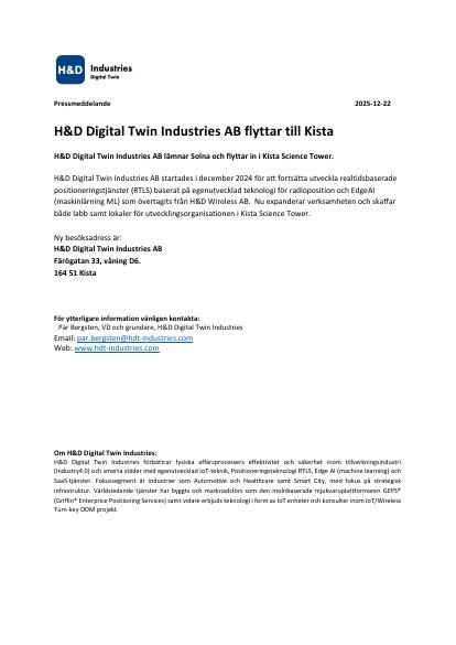 H&D Digital Twin Industries AB startades i december 2024 för att fortsätta utveckla realtidsbaserade positioneringstjänster (RTLS) baserat på egenutvecklad teknologi för radioposition och EdgeAI (maskinlärning ML) som övertagits från H&D Wireless AB. Nu expanderar verksamheten och skaffar både labb samt lokaler för utvecklingsorganisationen i Kista Science Tower.