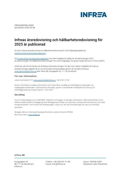 Denna information är sådan information som Infrea AB är skyldigt att offentliggöra enligt lagen om värdepappersmarknaden. Informationen lämnades, genom ovanstående kontaktpersons försorg, för offentliggörande den 8 april 2026 kl. 12:00 CEST.