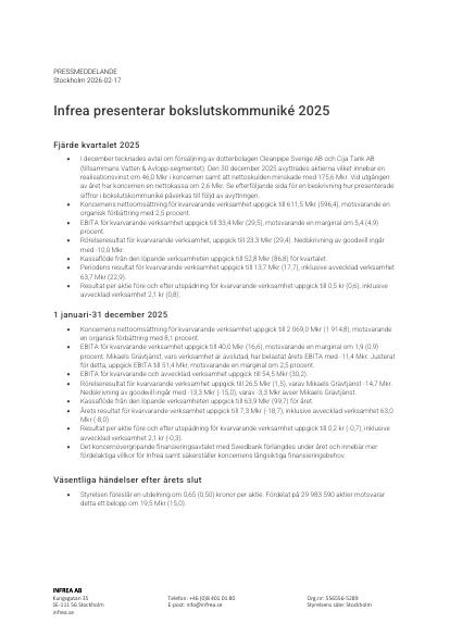 Denna information är sådan som Infrea AB är skyldig att offentliggöra enligt EU:s marknadsmissbruksförordning 596/2014. Informationen i detta pressmeddelande har publicerats genom ovanstående kontaktpersons försorg, för offentliggörande den 17 februari 2026 kl. 08.30 CET.