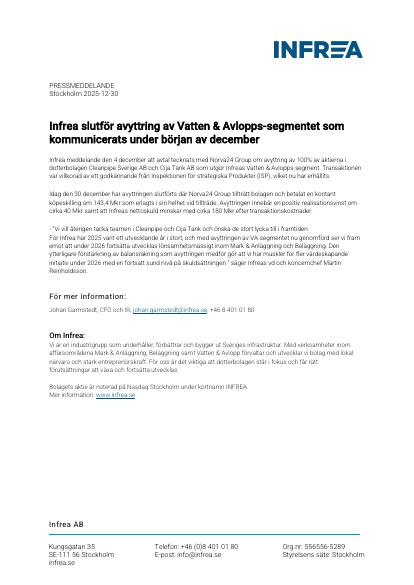 - "Vi vill återigen tacka teamen i Cleanpipe och Cija Tank och önska de stort lycka till i framtiden.För Infrea har 2025 varit ett utvecklande år i stort, och med avyttringen av VA-segmentet nu genomförd ser vi fram emot att under 2026 fortsätta utvecklas lönsamhetsmässigt inom Mark & Anläggning och Beläggning. Den ytterligare förstärkning av balansräkning som avyttringen medför gör att vi har muskler för fler värdeskapande initiativ under 2026 med en fortsatt sund nivå på skuldsättningen " säger Infreas vd och koncernchef Martin Reinholdsson.