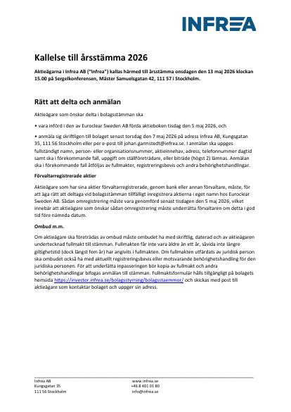 Aktieägarna i Infrea AB ("Infrea") kallas härmed till årsstämma onsdagen den 13 maj 2026 klockan 15.00 på Sergelkonferensen, Mäster Samuelsgatan 42, 111 57 i Stockholm.