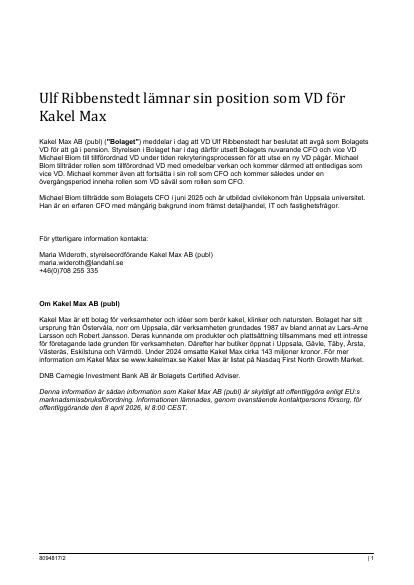 Kakel Max AB (publ) ("Bolaget") meddelar i dag att VD Ulf Ribbenstedt har beslutat att avgå som Bolagets VD för att gå i pension. Styrelsen i Bolaget har i dag därför utsett Bolagets nuvarande CFO och vice VD Michael Blom till tillförordnad VD under tiden rekryteringsprocessen för att utse en ny VD pågår. Michael Blom tillträder rollen som tillförordnad VD med omedelbar verkan och kommer därmed att entledigas som vice VD. Michael kommer även att fortsätta i sin roll som CFO och kommer således under en övergångsperiod inneha rollen som VD såväl som rollen som CFO.