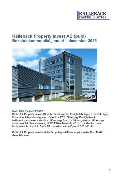 Kallebäck Property Invest AB (publ) är ett svenskt fastighetsbolag som indirekt äger och förvaltar fastigheten Kallebäck 17:2 i Göteborgs Stad. Fastigheten är en äganderätt med en modern och flexibel kontorsbyggnad, byggd 2002, och en total uthyrbar area om ca 38 000 kvm. Fastigheten är fullt uthyrd till Saab AB till 31 december 2031. Kallebäck Property Invest aktie är noterat på handelsplatsen NASDAQ First North Growth Market med Wildeco som Certified Adviser. (Tel: + 46 8 545 271 00, mejl: [email protected])