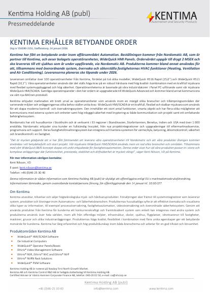 Kentima har fått en betydande order inom affärsområdet Automation. Beställningen kommer från Nordomatic AB, som är partner till Kentima, och avser bolagets operatörsenheter, WideQuick HMI Panels. Ordervärdet uppgår till drygt 2 MSEK och ska levereras till ett sjukhus som är under uppförande, via Nordomatic AB. Produkterna kommer bland annat användas för att, tillsammans med överordnande system, övervaka och säkerställa fastigheternas HVAC-funktioner (Heating, Ventilation and Air Conditioning). Leveranserna planeras ske löpande under 2026.