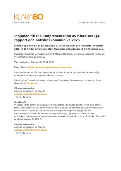 KlaraBo bjuder in till en presentation av fjärde kvartalet och resultatet för helåret 2025, kl. 09:00 den 13 februari 2026. Rapporten offentliggörs kl. 08:00 samma dag.