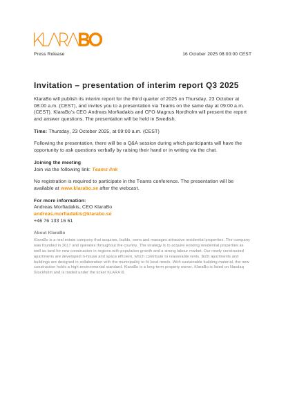 KlaraBo will publish its interim report for the third quarter of 2025 on Thursday, 23 October at 08:00 a.m. (CEST), and invites you to a presentation via Teams on the same day at 09:00 a.m. (CEST). KlaraBo's CEO Andreas Morfiadakis and CFO Magnus Nordholm will present the report and answer questions. The presentation will be held in Swedish.