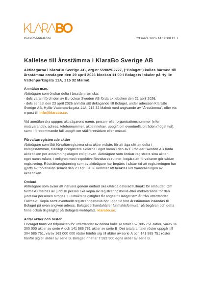 Aktieägarna i KlaraBo Sverige AB, org.nr 559029-2727, (”Bolaget”) kallas härmed till årsstämma onsdagen den 29 april 2026 klockan 11.00 i Bolagets lokaler på Hyllie Vattenparksgata 11A, 215 32 Malmö.