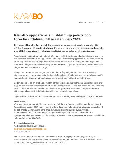 Denna information är sådan information som KlaraBo är skyldigt att offentliggöra enligt EU:s marknadsmissbruksförordning. Informationen lämnades, genom ovanstående kontaktpersoners försorg, för offentliggörande den 2026-02-13 07:55 CET.