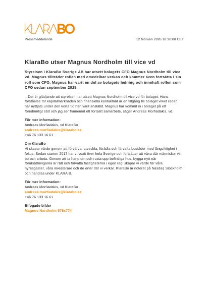 Styrelsen i KlaraBo Sverige AB har utsett bolagets CFO Magnus Nordholm till vice vd. Magnus tillträder rollen med omedelbar verkan och kommer även fortsätta i sin roll som CFO. Magnus har varit en del av bolagets ledning och innehaft rollen som CFO sedan september 2025.