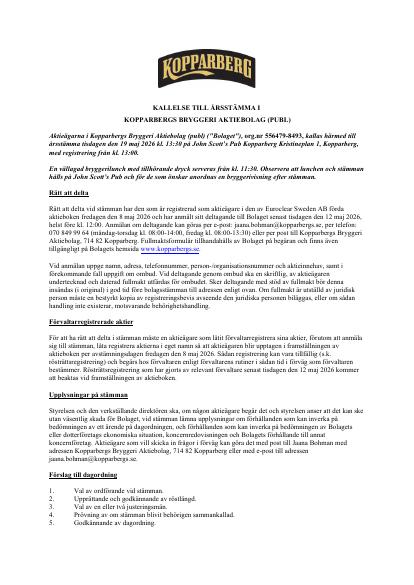 Aktieägarna i Kopparbergs Bryggeri Aktiebolag (publ) ("Bolaget"), org.nr 556479-8493, kallas härmed till årsstämma tisdagen den 19 maj 2026 kl. 13:30 på John Scott's Pub Kopparberg Kristineplan 1, Kopparberg, med registrering från kl. 13:00.