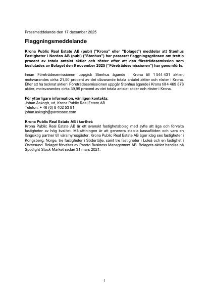 Krona Public Real Estate AB (publ) ("Krona" eller "Bolaget") meddelar att Stenhus Fastigheter i Norden AB (publ) ("Stenhus") har passerat flaggningsgränsen om trettio procent av totala antalet aktier och röster efter att den företrädesemission som beslutades av Bolaget den 6 november 2025 ("Företrädesemissionen") har genomförts.