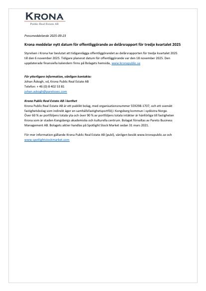 Styrelsen i Krona har beslutat att tidigarelägga offentliggörandet av delårsrapporten för tredje kvartalet 2025 till den 6 november 2025. Tidigare planerat datum för offentliggörande var den 18 november 2025. Den uppdaterade finansiella kalendern finns på Bolagets hemsida, www.kronapublic.se