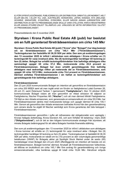 Styrelsen i Krona Public Real Estate AB (publ) ("Krona" eller "Bolaget") har idag beslutat om en företrädesemission om cirka 145,1 Mkr ("Företrädesemissionen"). Teckningskursen har fastställts till 36,35 SEK per aktie. Den som på avstämningsdagen den 13 november 2025 är införd i aktieboken som aktieägare i Krona erhåller en (1) teckningsrätt för varje innehavd aktie. Nio (9) teckningsrätter berättigar till teckning av fem (5) aktier. Bolaget har erhållit teckningsförbindelser från befintliga aktieägare vilka sammanlagt uppgår till cirka 37,2 Mkr, motsvarande cirka 25,6 procent av Företrädesemissionen. Bolaget har även erhållit garantiåtagande från befintlig aktieägare med sedvanliga villkor på resterande del av Företrädesemissionen, som uppgår till cirka 107,9 Mkr, motsvarande cirka 74,4 procent av Företrädesemissionen. Därmed omfattas Företrädesemissionen i sin helhet av teckningsförbindelser och garantiåtagande från befintliga aktieägare.