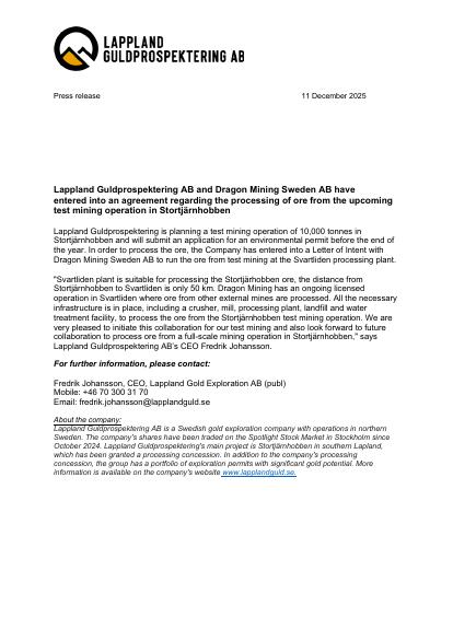 Lappland Guldprospektering AB and Dragon Mining Sweden AB have entered into an agreement regarding the processing of ore from the upcoming test mining operation in Stortjärnhobben