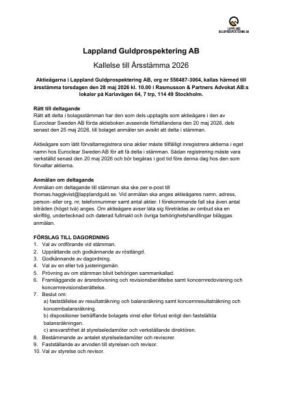 Aktieägarna i Lappland Guldprospektering AB, org nr 556487-3064, kallas härmed till årsstämma torsdagen den 28 maj 2026 kl. 10.00 i Rasmusson & Partners Advokat AB:s lokaler på Karlavägen 64, 7 trp, 114 49 Stockholm.