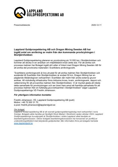 Lappland Guldprospektering AB och Dragon Mining Sweden AB har ingått avtal om anrikning av malm från den kommande provbrytningen i Stortjärnhobben