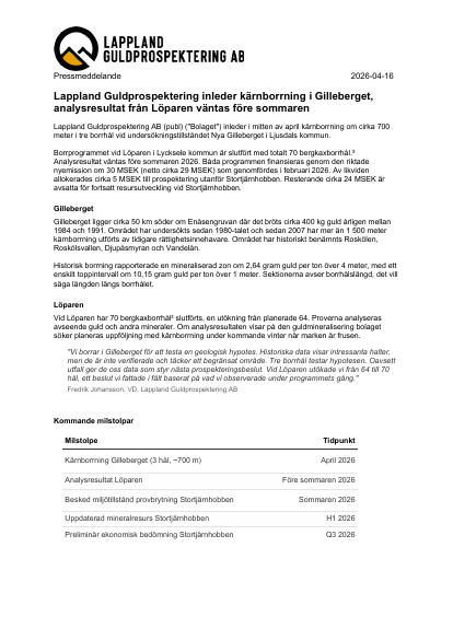 Lappland Guldprospektering AB (publ) ("Bolaget") inleder i mitten av april kärnborrning om cirka 700 meter i tre borrhål vid undersökningstillståndet Nya Gilleberget i Ljusdals kommun. Borrprogrammet vid Löparen i Lycksele kommun är slutfört med totalt 70 bergkaxborrhål.² Analysresultat väntas före sommaren 2026. Båda programmen finansieras genom den riktade nyemission om 30 MSEK (netto cirka 29 MSEK) som genomfördes i februari 2026. Av likviden allokerades cirka 5 MSEK till prospektering utanför Stortjärnhobben. Resterande cirka 24 MSEK är avsatta för fortsatt resursutveckling vid Stortjärnhobben.