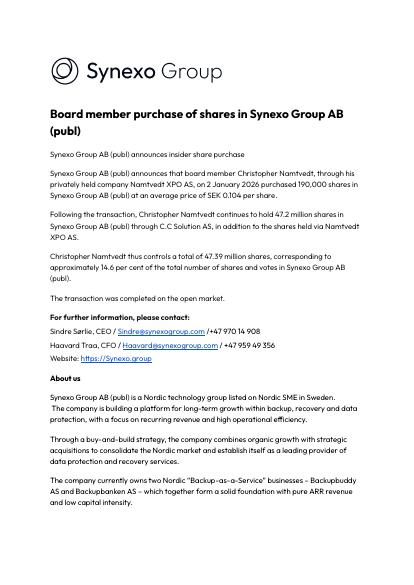 Synexo Group AB (publ) announces that board member Christopher Namtvedt, through his privately held company Namtvedt XPO AS, on 2 January 2026 purchased 190,000 shares in Synexo Group AB (publ) at an average price of SEK 0.104 per share.