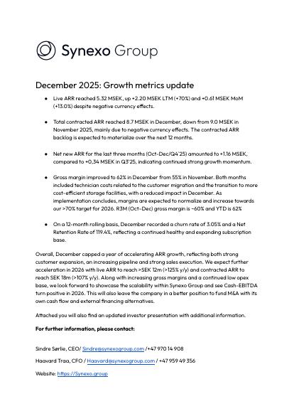 Overall, December capped a year of accelerating ARR growth, reflecting both strong customer expansion, an increasing pipeline and strong sales execution. We expect further acceleration in 2026 with live ARR to reach >SEK 12m (>125% y/y) and contracted ARR to reach SEK 18m (>107% y/y). Along with increasing gross margins and a continued low opex base, we look forward to showcase the scalability within Synexo Group and see Cash-EBITDA turn positive in 2026. This will also leave the company in a better position to fund M&A with its own cash flow and external financing alternatives.