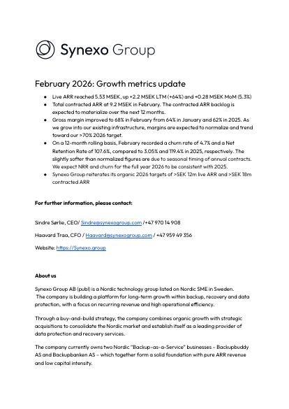 - Synexo Group reiterates its organic 2026 targets of >SEK 12m live ARR and >SEK 18m contracted ARR