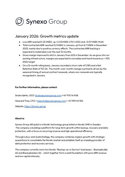 Synexo Group's strategy is to create value through the acquisition and integration of profitable companies within backup, SaaS, IT security and data protection, generating cost synergies across infrastructure, licenses and operations, and strengthening customer trust through Nordic data storage that ensures regulatory compliance, data sovereignty and high security.